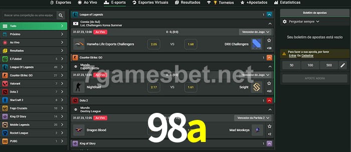 O 98a oferece uma grande seleção de opções de apostas em e-sports com probabilidades competitivas